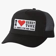 Embroidered ironed-on patch on universal mesh-back trucker hat. Five panel, low crown style. Black.