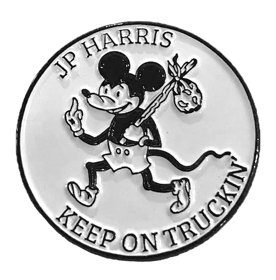 Enamel-filled metal pin with brass butterfly catch. 1" diameter.